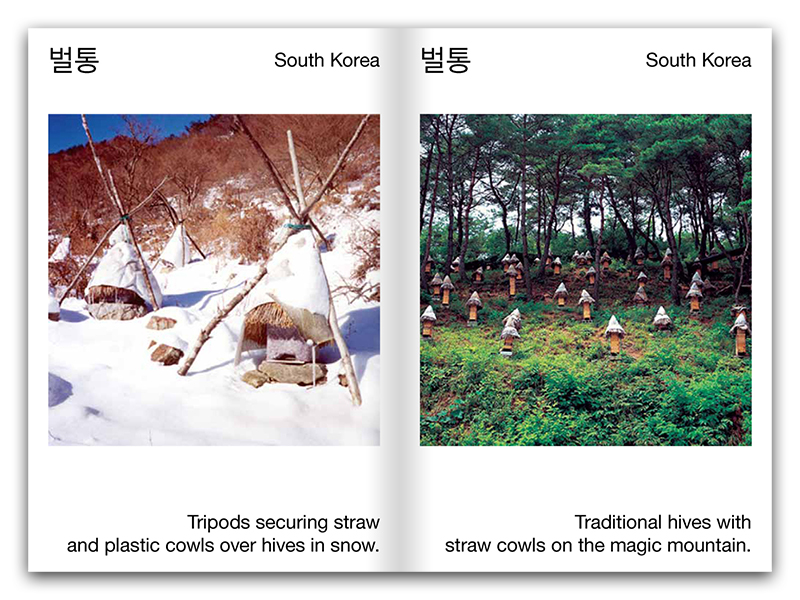 “Another favourite would be the Korean beehives: with their straw cowls and wooden tripods securing them in place, these modern apiaries look like something lost in time, or perhaps something from a beekeeping fairytale.”