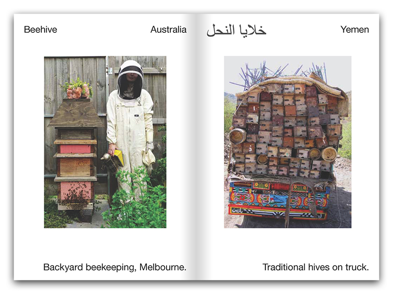 “I also like the spread of one of our own hives, in a backyard in East Brunswick, and a load of traditional hives on the back on a truck in Yemen. Both the truck and the our hive are painted in similar colours and this additional attention to detail (that has no impact on yields) reminds us that beekeeping cultures are more than honey. The Melbourne hive is in the backyard of ceramicist Zhu Ohmu and features one of her ceramics. The beekeeper pictured is Samantha McIntyre, a regular beekeeper in the Honey Fingers Collective.”