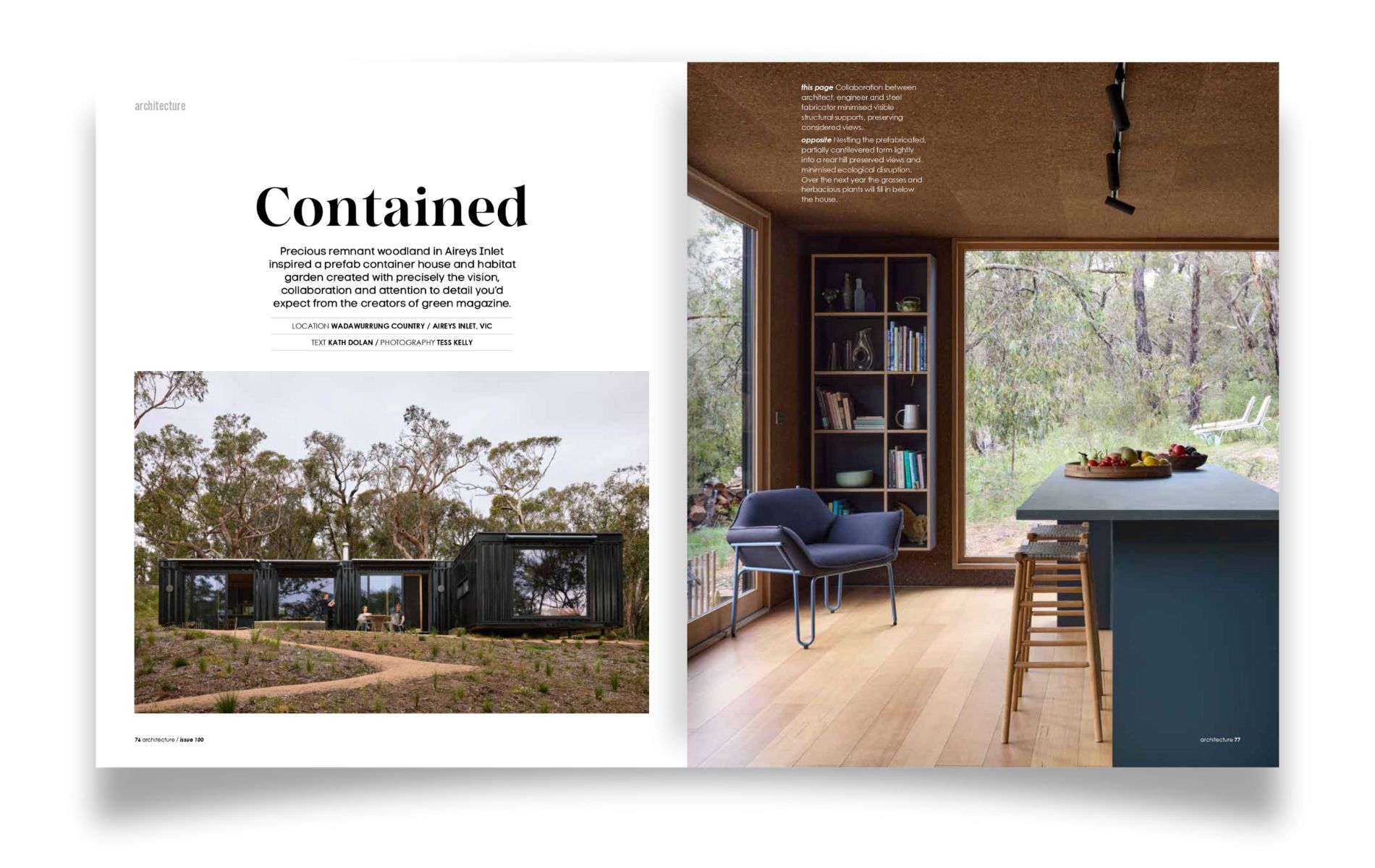 And a special bonus this issue; precious remnant woodland in Aireys Inlet inspired a prefab container house and habitat garden created with precisely the vision, collaboration and attention to detail you’d expect from the creators of green magazine, Tamsin O’Neill and Tom Bodycomb (in collaboration with Tamsin’s sister Rema O’Neill Architect).