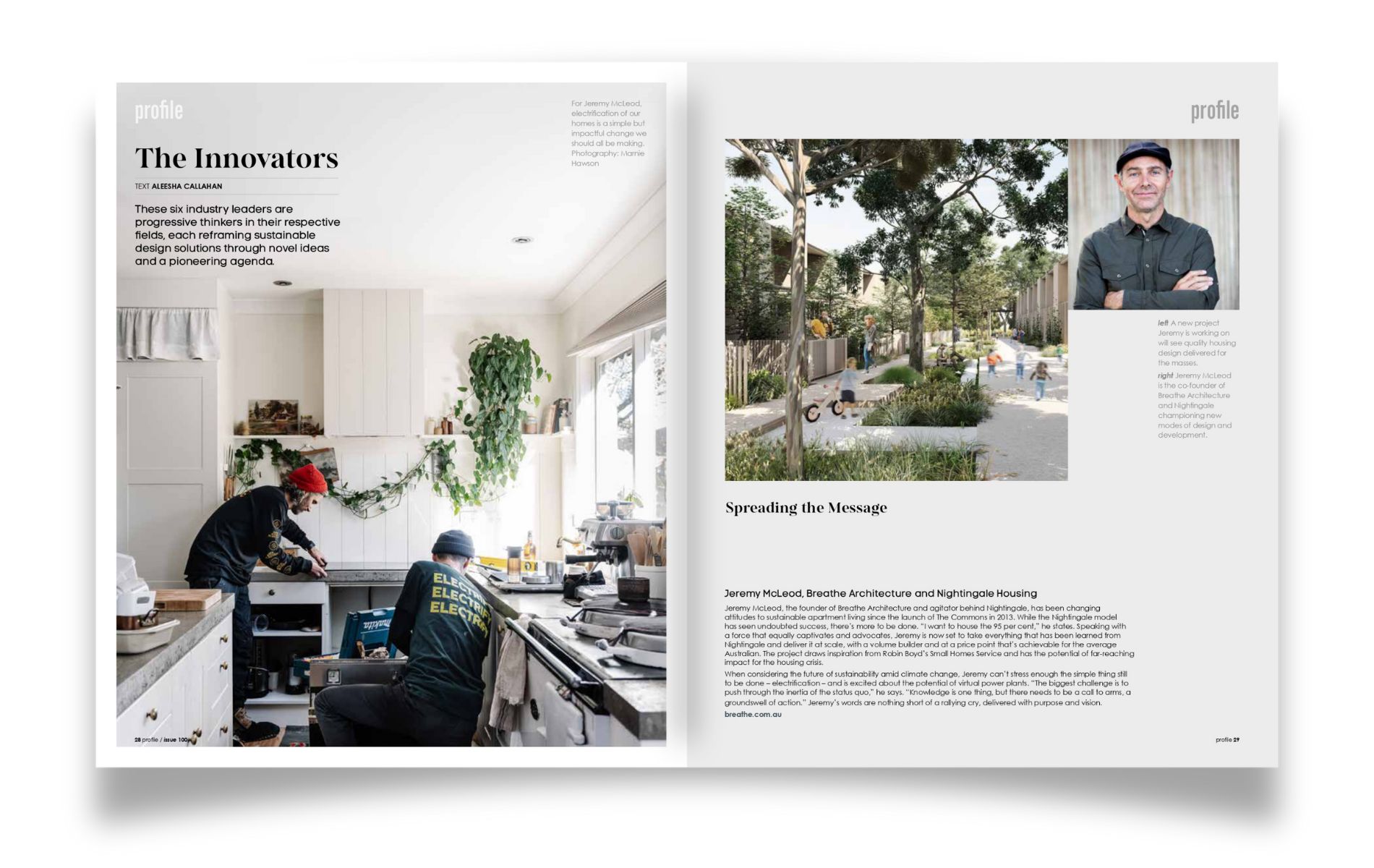 In this issue, our special profile highlights the work six industry leaders who are progressive thinkers in their respective fields, each reframing sustainable design solutions through novel ideas and a pioneering agenda;Â Jeremy McLeod (Breathe Architecture and Nightingale Housing), Sasha Titchkosky (Koskela), Ross Harding (Finding Infinity), Ben Shaw (Ben Shaw Permaculture and Farm My School), Sarah K (supercyclers), and Rebecca Trenorden (Versa Studio).