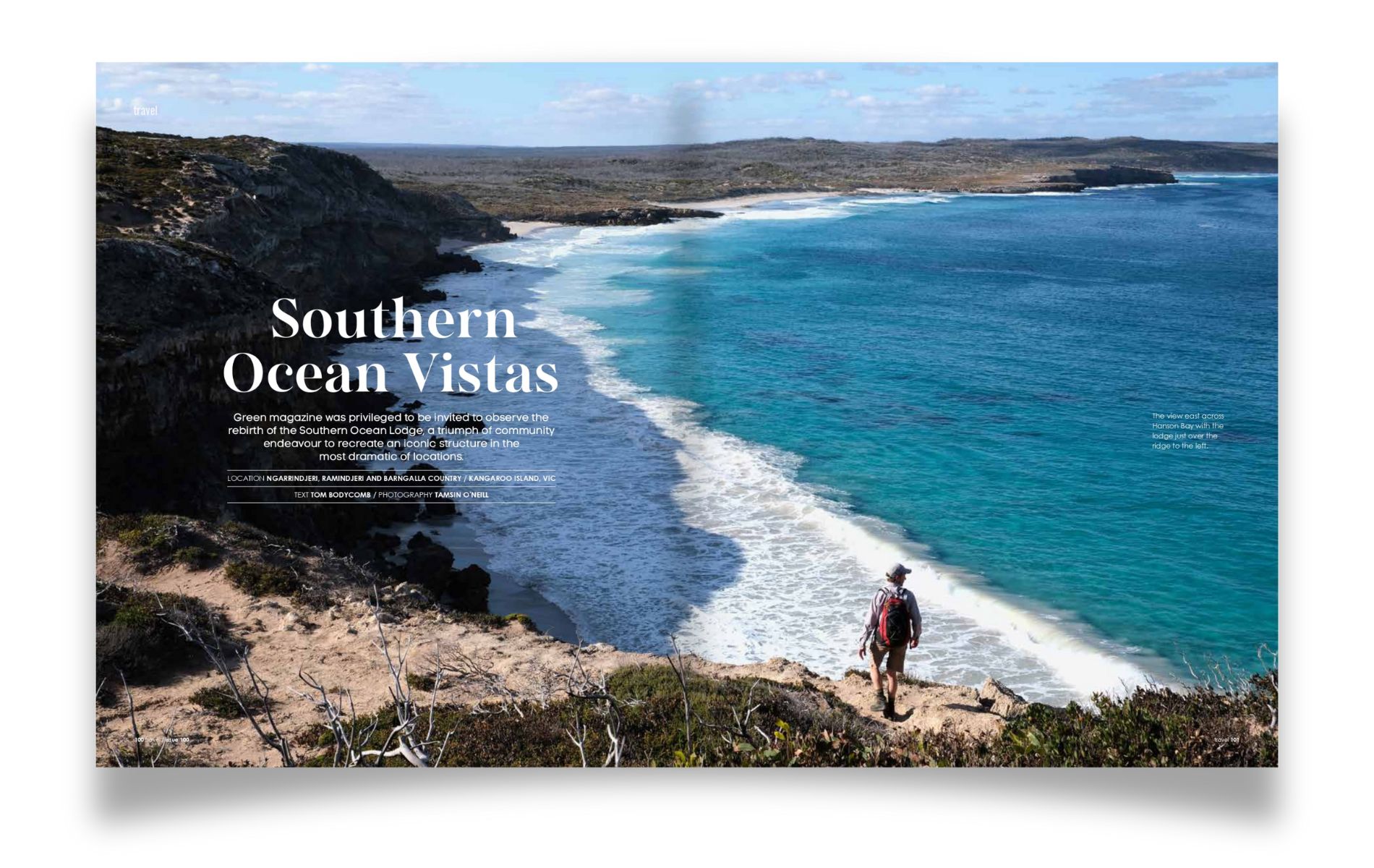 And finally for our travel feature, green magazine was privileged to be invited to observe the rebirth of the Southern Ocean Lodge, a triumph of community endeavour to recreate an iconic structure in the most dramatic of locations.