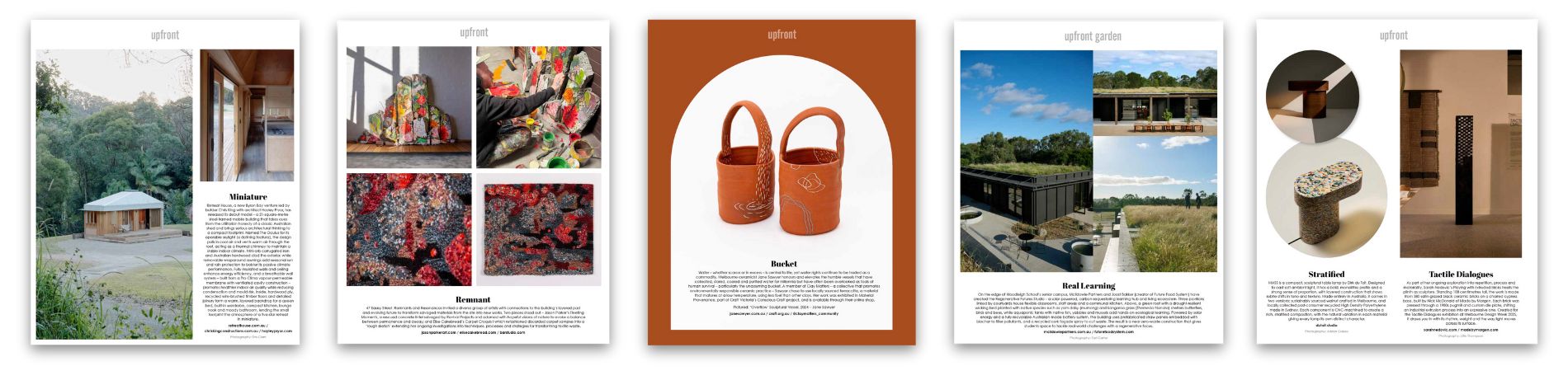 Also featured in Upfront and Upfront Garden: Dirk du Toit, Sarah Nedovic, Made by Morgen, Jason Parker, Elise Cakebread, Bar Studio, Taylor and Hinds, Lane Group, Scholé, Robin Boyd Foundation, Alexsandra Pontonio, Volker Haug Studio, Flack Studio, Jane Sawyer, Craft Victoria, Pihlmann Architects, La Biennale, Hayley Pryor, Retreat House, Chris King Constructions, Main Studio / Bronwen Main, Mark Tuckey, Grace Moore Film, Ma House Supply Store, Andy Ward, Assembly Label, Mr and Mrs White, and Bonnie and Neil.