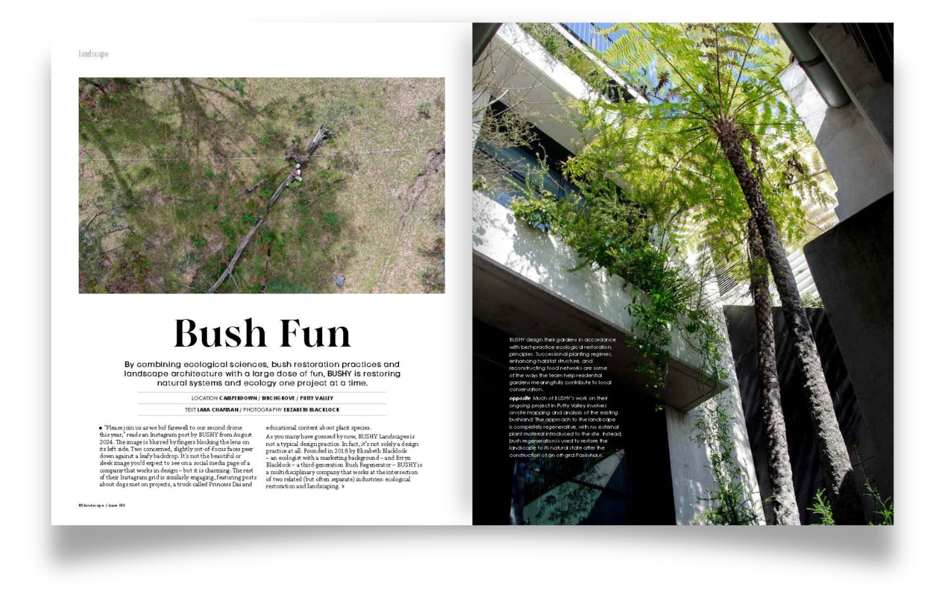 And our second landscape feature shows how gardens can be both playful and restorative. Founded by ecologist Elizabeth Blacklock and bush regenerator Erryn Blacklock, BUSHY Landscapes combines ecological science, bush restoration and landscape design with a strong sense of fun, turning even small urban plots into thriving habitats and places for joy.