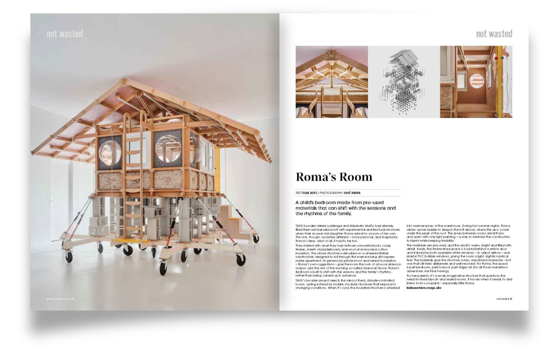 In our Not Wasted feature, Barcelona-based studio TAKK create a bedroom for their daughter Roma inside their vast loft, built from leftover materials including concrete blocks, timber and recycled insulation. Raised on wheels with a pitched roof, the small structure moves through the apartment, questioning fixed layouts while offering Roma a space that is part bedroom, part lookout and part stage set.