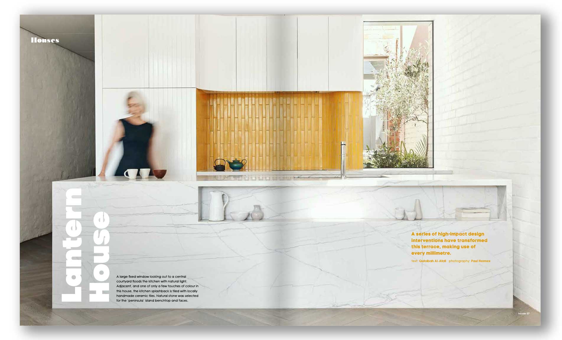 Next up, sink your teeth into this contemporary terrace transformation in bayside Albert Park in Melbourne, in which Topology Studio were commissioned to design a renovation of one of ten identical two-storey Victorian terraces built in the late 1800s, and went on to apply a series of high-impact design interventions that made use of every millimetre.lantern house—green magazine issue 85 mockup