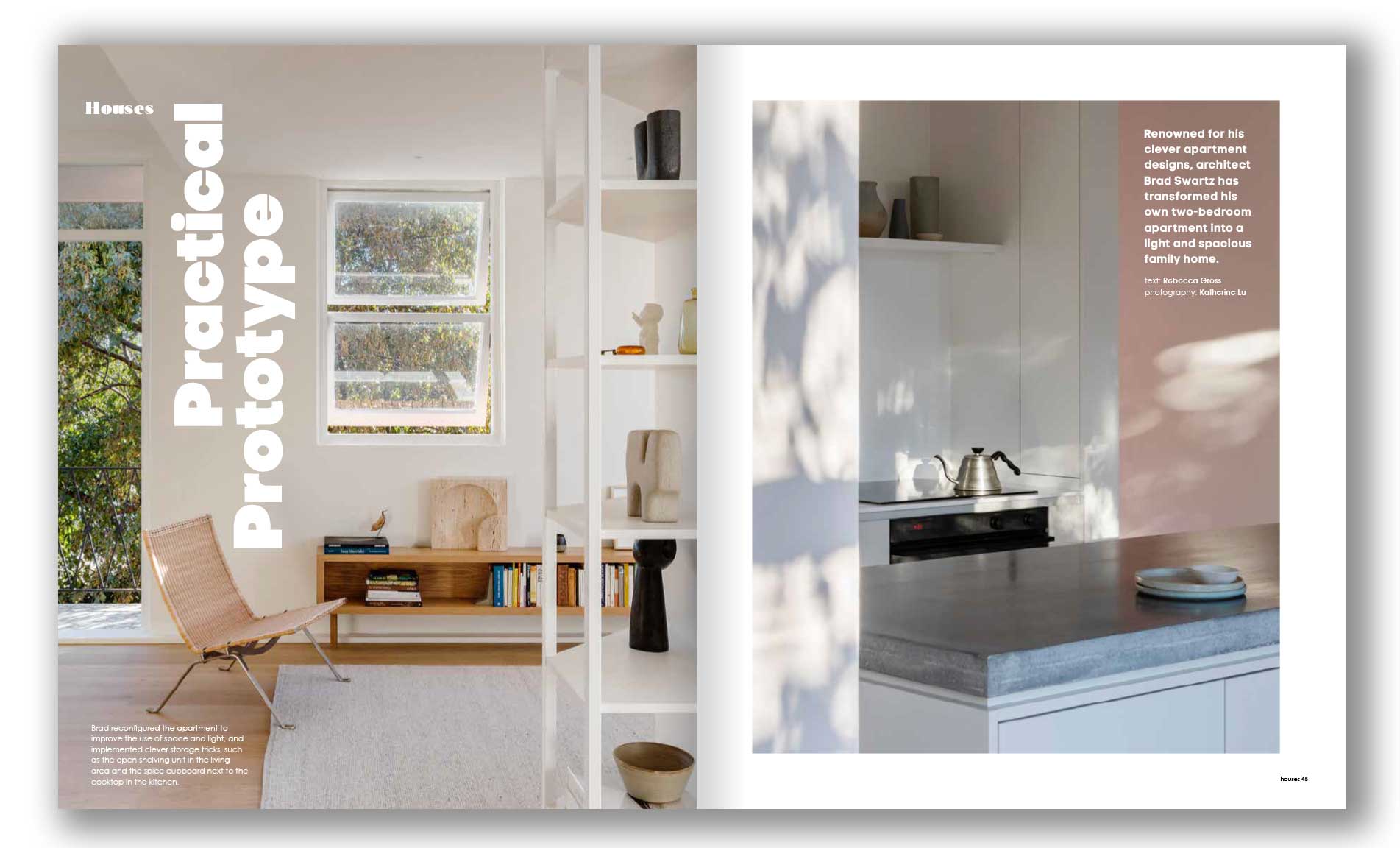 Jump over to Cremorne in Sydney’s Lower North Shore, where Brad Swartz and his partner Jade have reimagined a new sense of space in their apartment by switching the locations of the kitchen and living area, and removing walls for greater openness and connection.practical prototype—green magazine issue 85 mockup