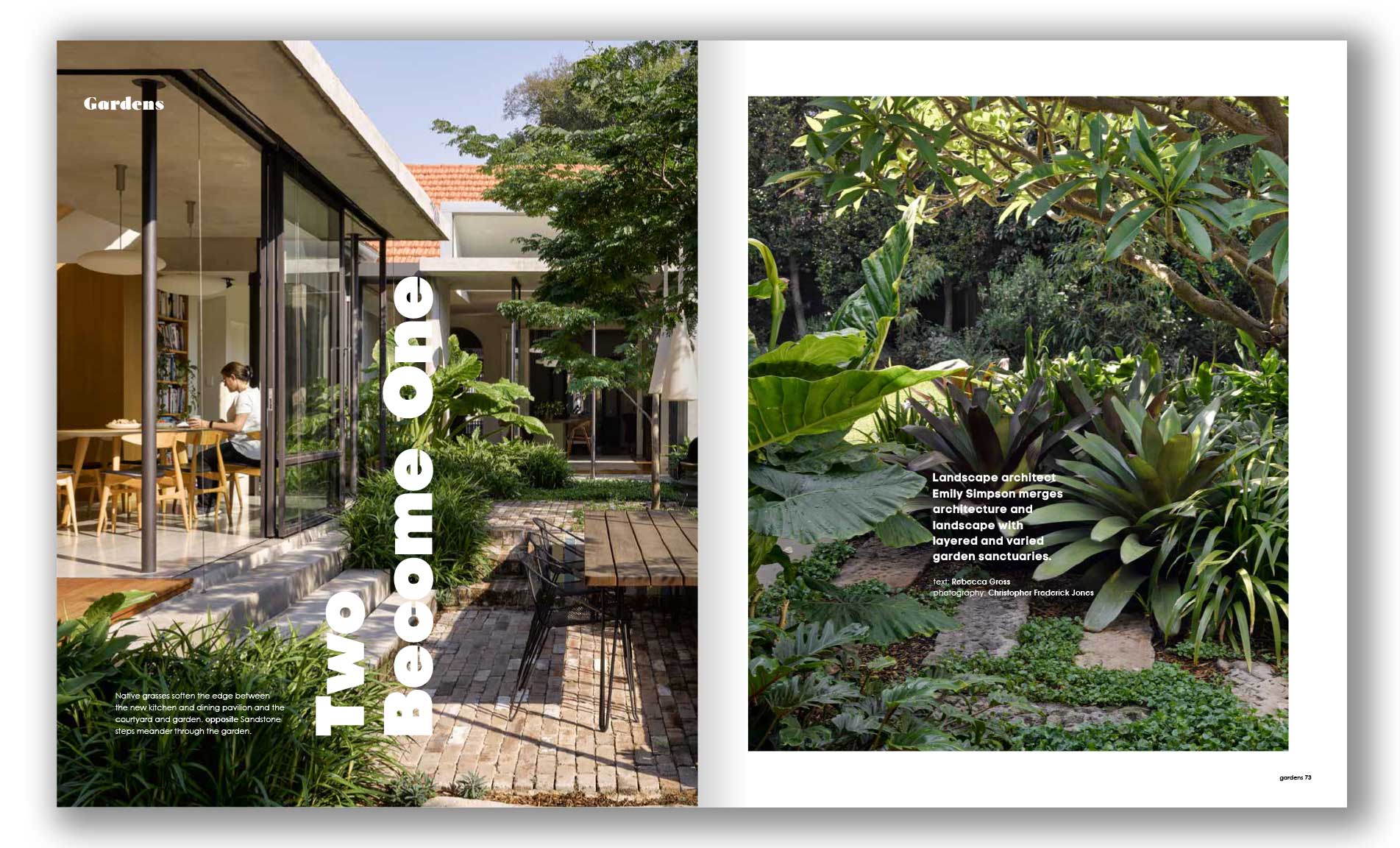 Next, meet landscape architect Emily Simpson, who developed calming, playful and practical garden spaces that merge architecture and landscape with layered and varied garden sanctuaries in this heritage house and garden project in Glebe, Sydney.two become one—green magazine issue 85 mockup