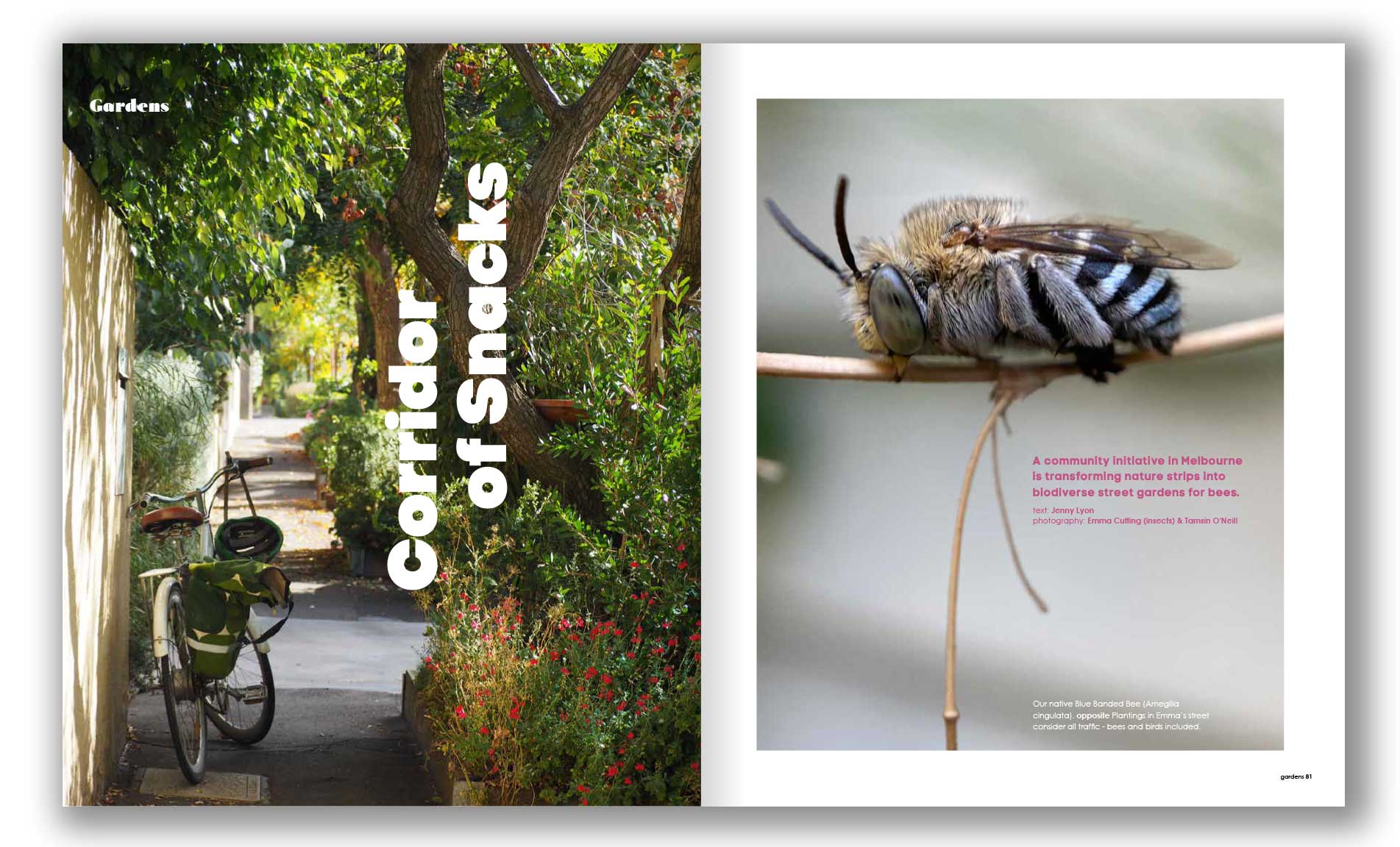 Learn about a community initiative in Melbourne that’s transforming nature strips into biodiverse street gardens for bees, led by local resident and force of nature, Emma Cutting.corridor of snacks—green magazine issue 85 mockup