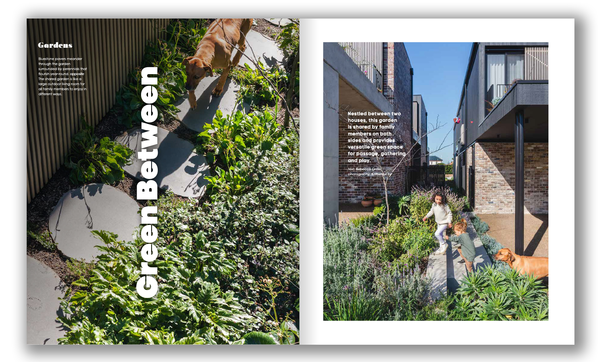 Next up, our garden articles, starting with a shared garden by Sharon Campbell Architects. Nestled between two houses, this long narrow garden is between two multigenerational buildings, shared by family members on both sides and provides versatile green space for passage, gathering and play.