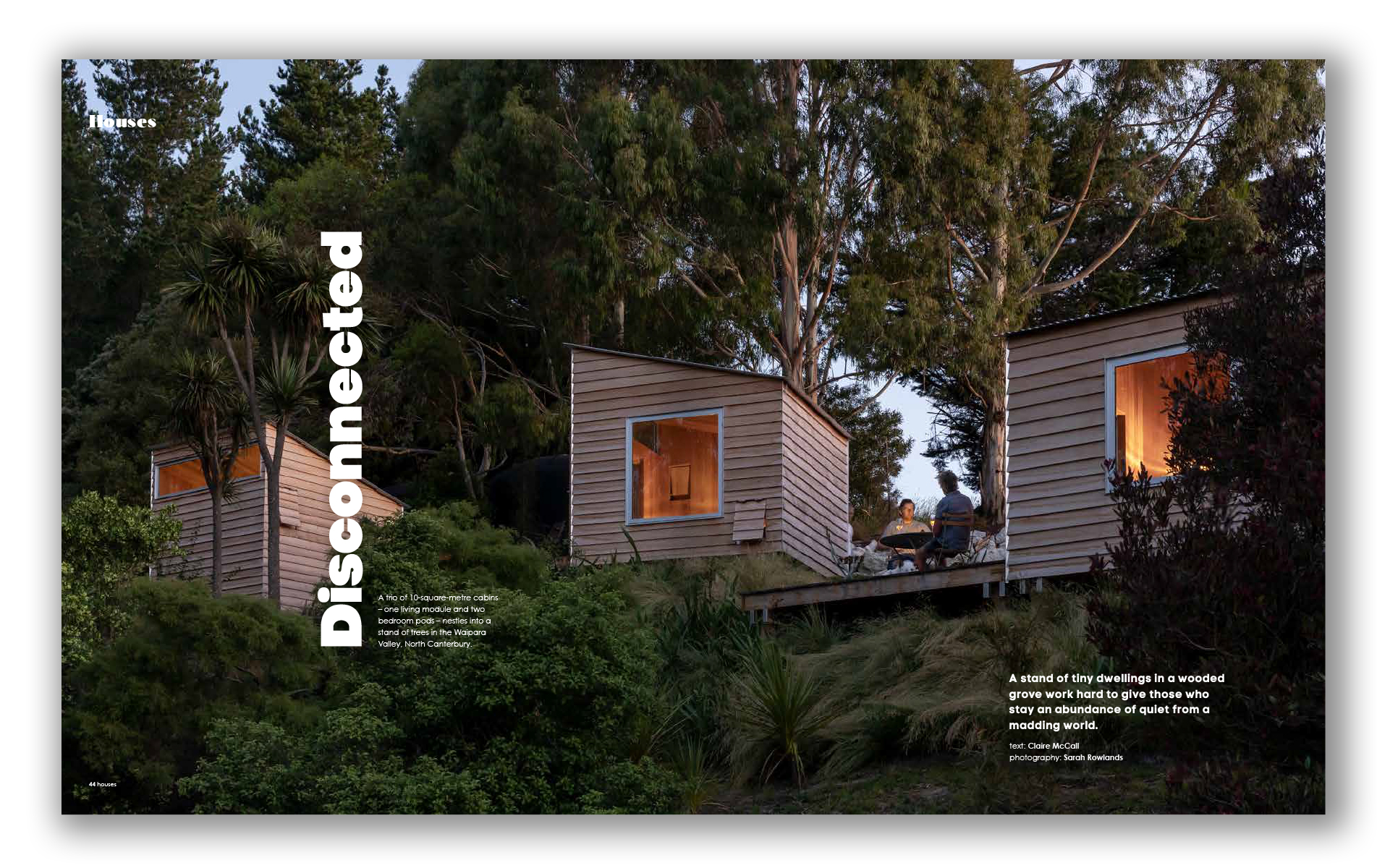 Then, we head to New Zealand to look at a series of three 10-square-metre cabins that offer the most rudimentary, low-impact living, with architecture by Johnstone Callaghan Architects.