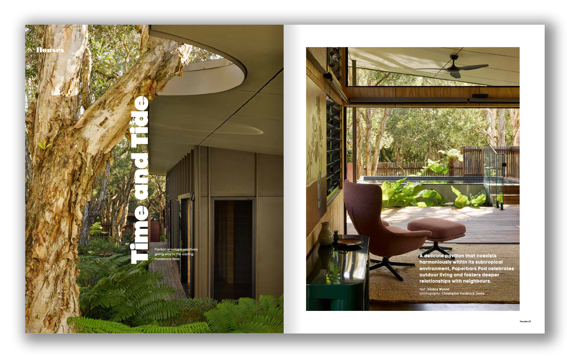 And for our final house feature, a delicate pavilion by Bark Architects that coexists harmoniously within its subtropical environment, Paperbark Pod celebrates outdoor living and fosters deeper relationships with neighbours.