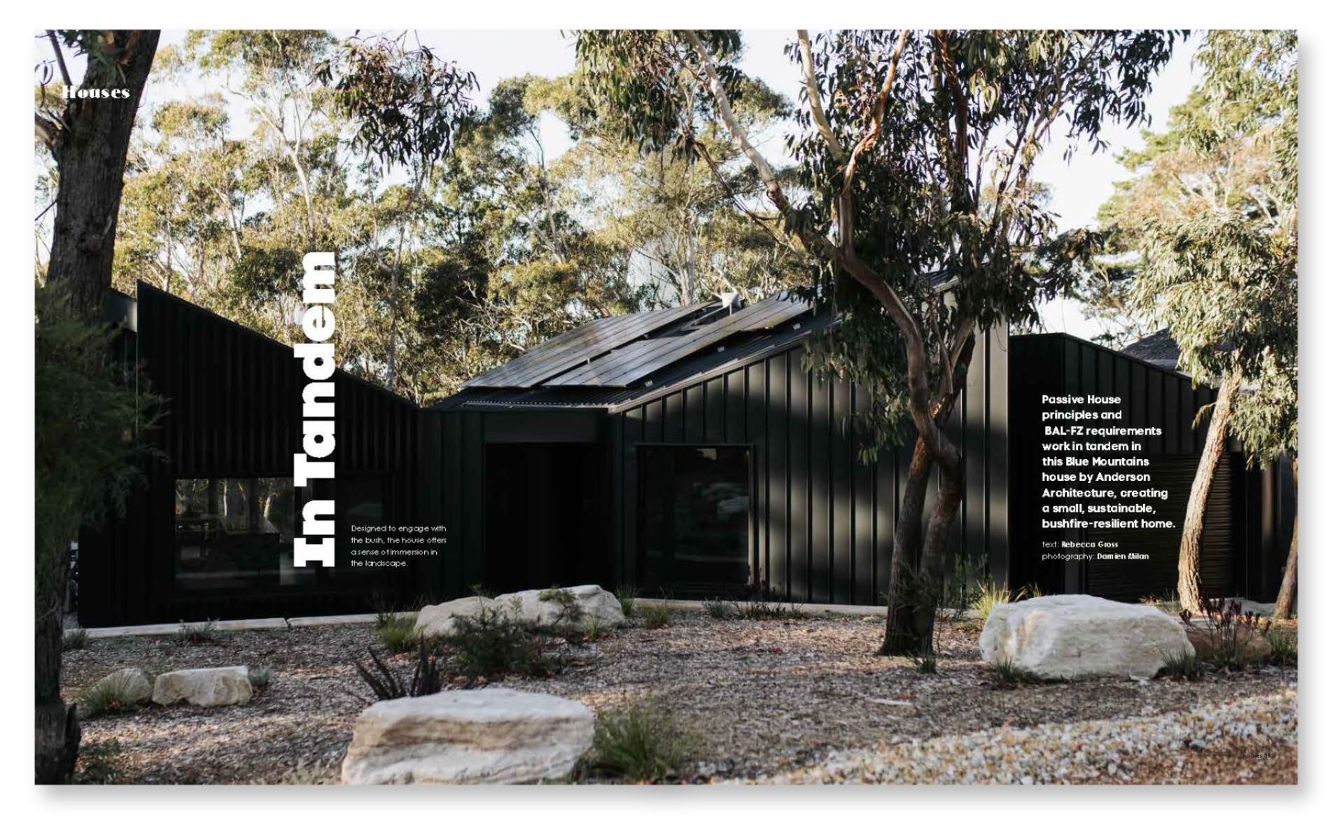 Then, our first house feature; Passive House principles and BAL-FZ requirements work in tandem in this Blue Mountains house by Anderson Architecture, creating a small, sustainable, bushfire-resilient home.