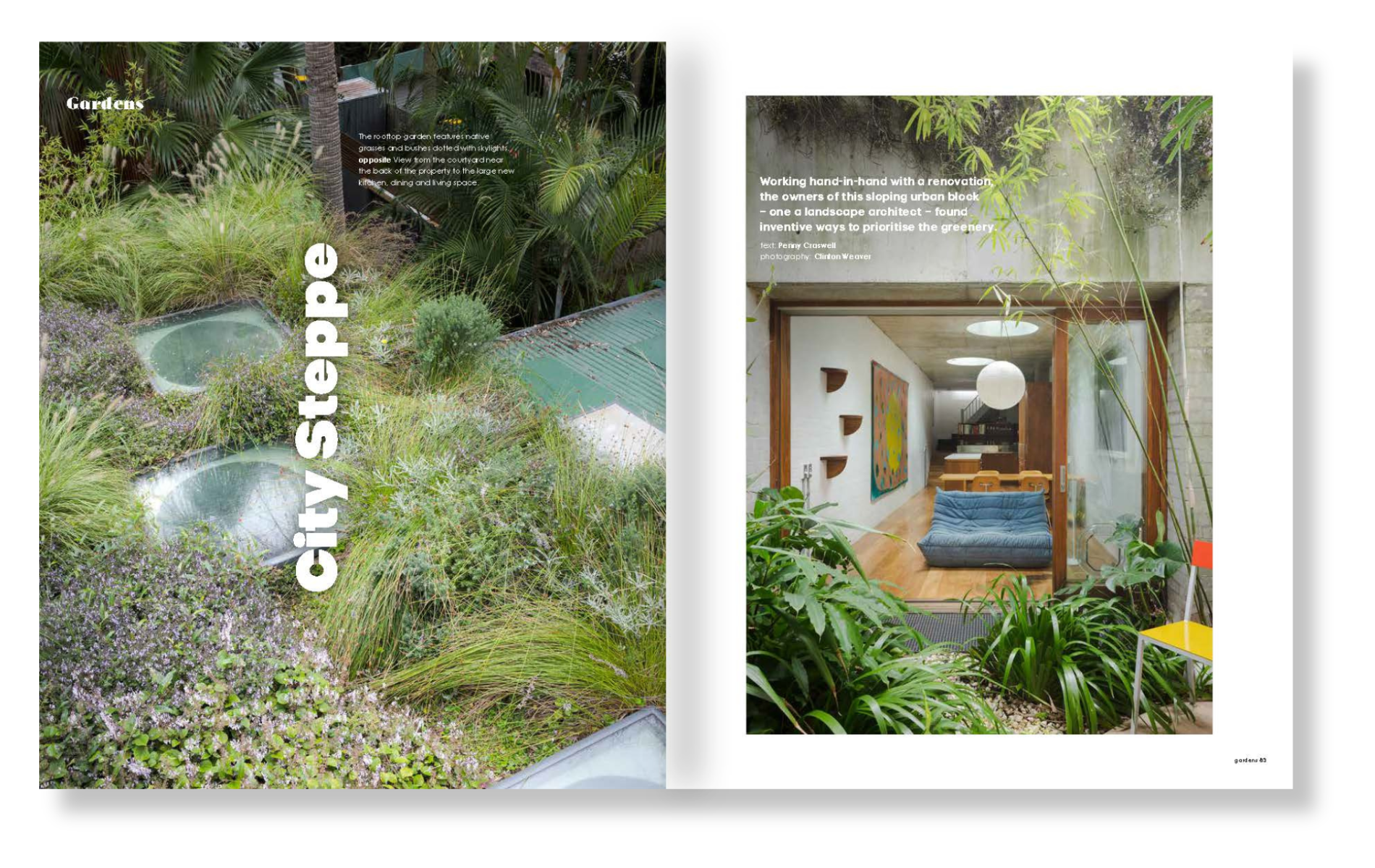 In our second garden; a renovation and extension of a tiny terrace in Sydney’s Redfern—home of Sacha Coles, the leader of one of Australia’s largest and most well-known landscape architecture studios, ASPECT—centred around a rooftop garden planted with Australian natives, complemented by a courtyard garden towards the back of the site and a community garden on the street out front. Architecture by Anthony Gill.