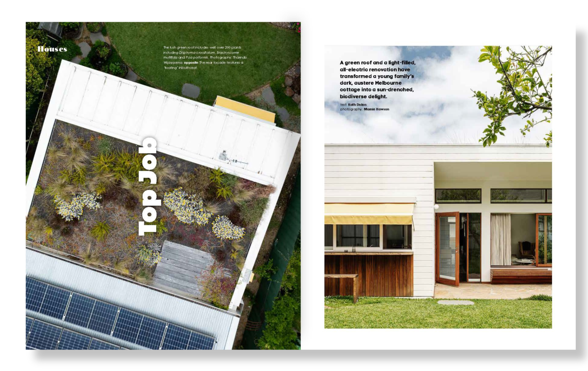 For our third house feature; a green roof and a light-filled, all-electric renovation have transformed a young family’s dark, austere Melbourne cottage into a sun-drenched, biodiverse delight. Architecture by Nest Architects, with Emilio Fuscaldo at the helm.